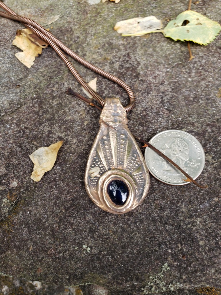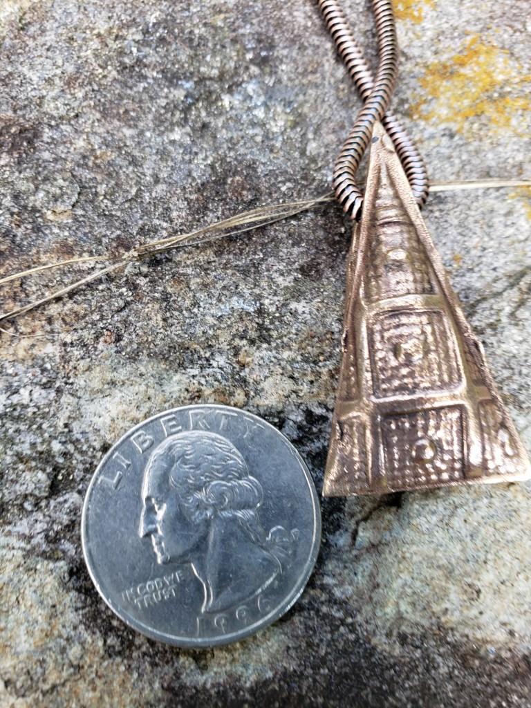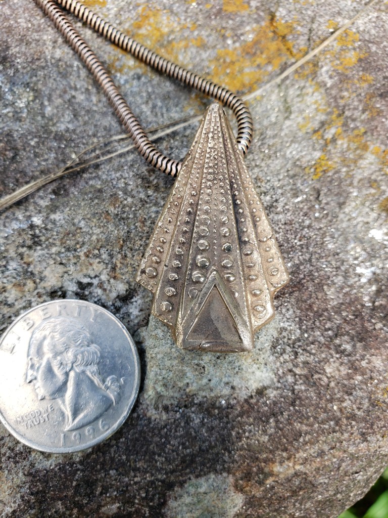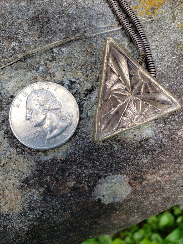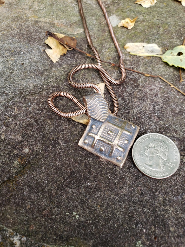 The same two pieces, after firing, tumbling, and applying a light patina appear below. In all images of finished pieces, a coin is included to provide scale.