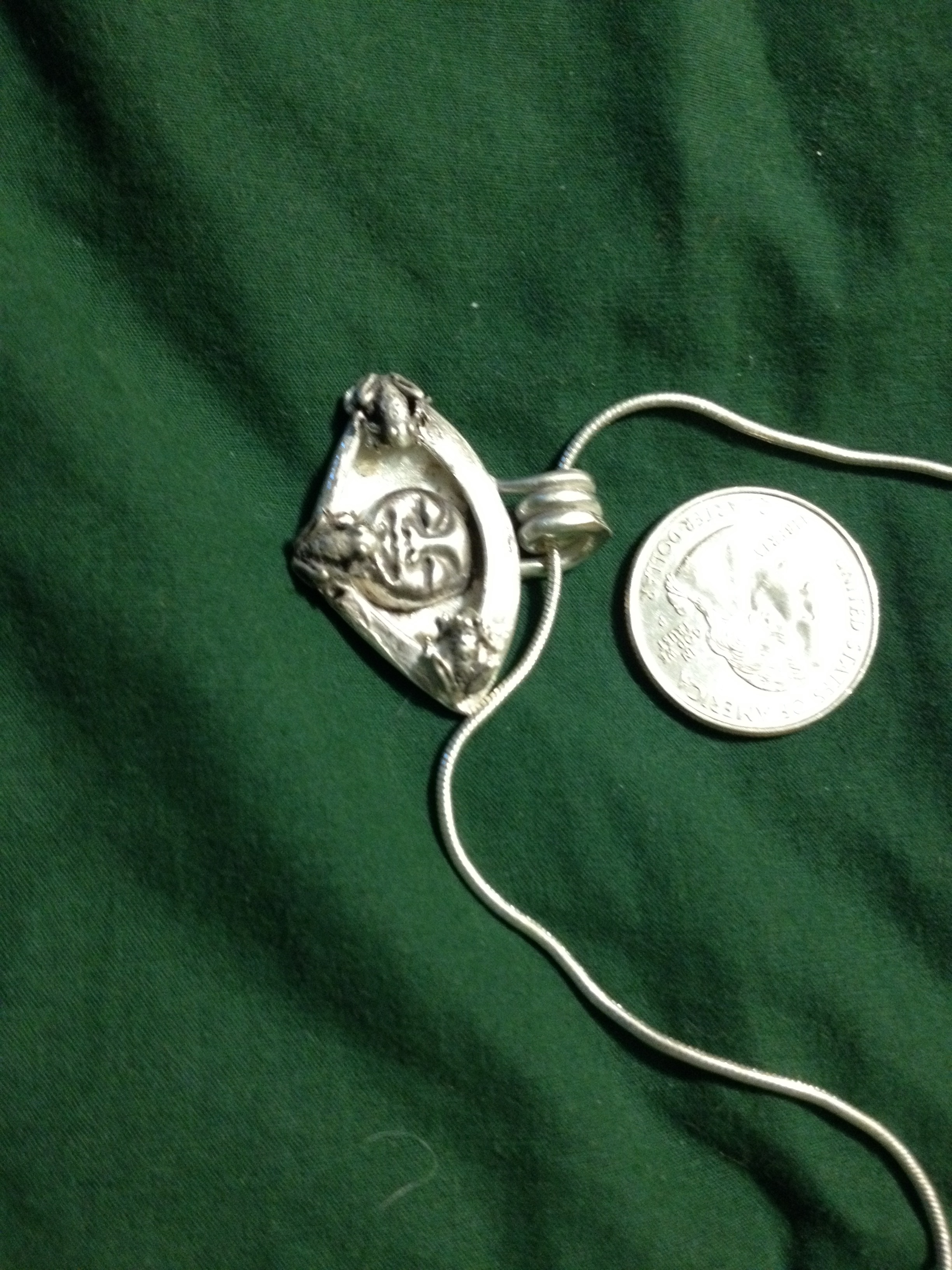RAN’S KINGDOM. Ran is an old Norse sea goddess. This pendant celebrates her kingdom by combining an image of a fish with fine silver and 22 carat gold. The coin is included to provide scale.WHO’S THERE? Are the curious frogs asking about the moon? Or is the moon wondering why frogs are staring downward? No answers are provided in this fine silver pendant, just whimsical art.KALEVIPOEG. Kalevipoeg is the name of Estonia’s national epic and its national hero. This fine silver pendant honors Kalevipoeg, who journeys to the ends of the earth to expand his knowledge.THUNDERER. This silver pendant might represent Thor’s hammer. However, it might also represent the hammer of Uku, an Estonian god who carried a hammer. The pendant is based on imagery I saw on a trip to Estonia.SQUTCHIN’. These fine silver and 22 carat gold earrings are just the thing for the discerning hairy hominid seeker. Do they represent sasquatch, the yeti, or even the swamp ape? That’s for you to decide. πKOKOPELI’S JOURNEY. This pendant, made of fine silver and hematite, commemorates Kokopelli, the humpback flute player of the southwestern United States.